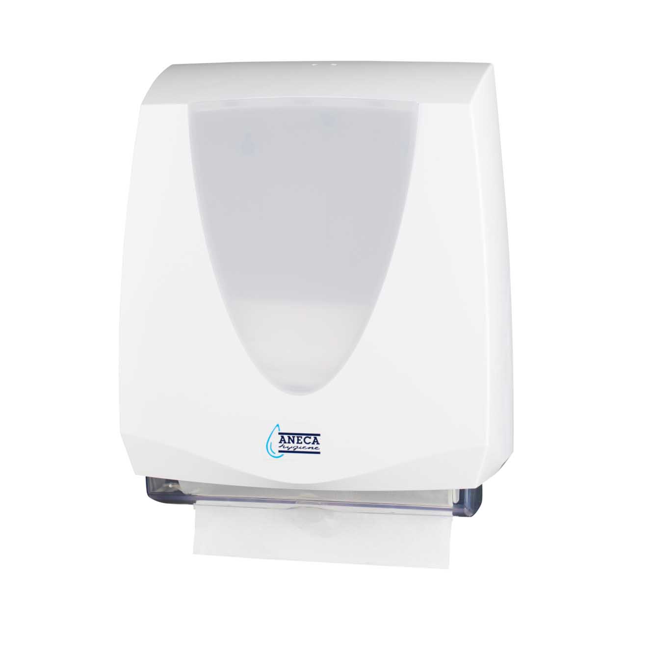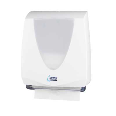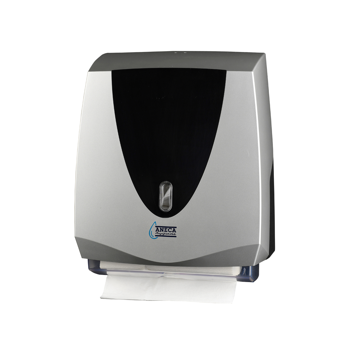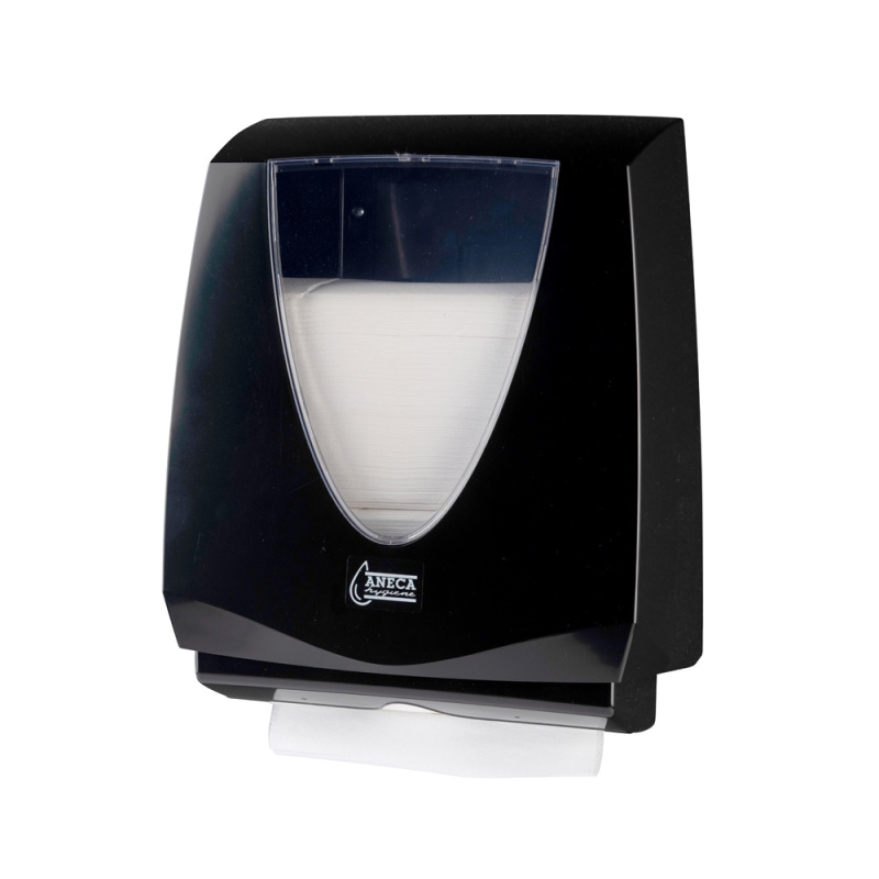 L’Aneca Prima est un distributeur robuste et élégant, conçu pour un usage fréquent. La fenêtre d’inspection permet de vérifier à tout moment le stock d’essuie-mains. L’appareil peut contenir 3 paquets de 160 essuie-mains au maximum. Chaque essuie-mains consiste en une feuille de papier double épaisseur pliée en quatre, d’une dimension de 23 x 31 cm.