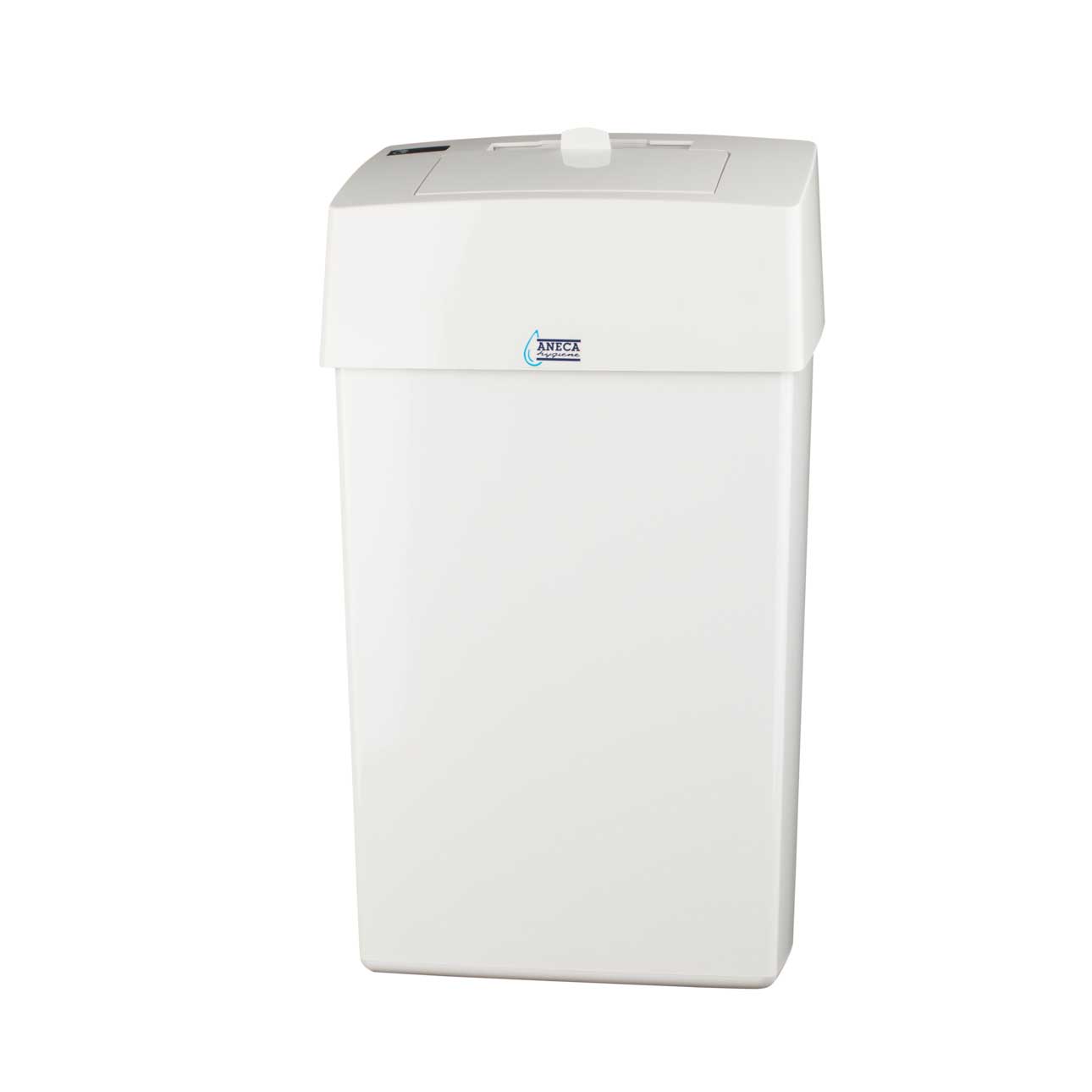 L’Aneca Ladybin est une poubelle pour serviettes hygiéniques d’une capacité de 23 l qui s’ouvre manuellement ou automatiquement à l’aide d’un capteur, et est réalisée en ABS blanc.